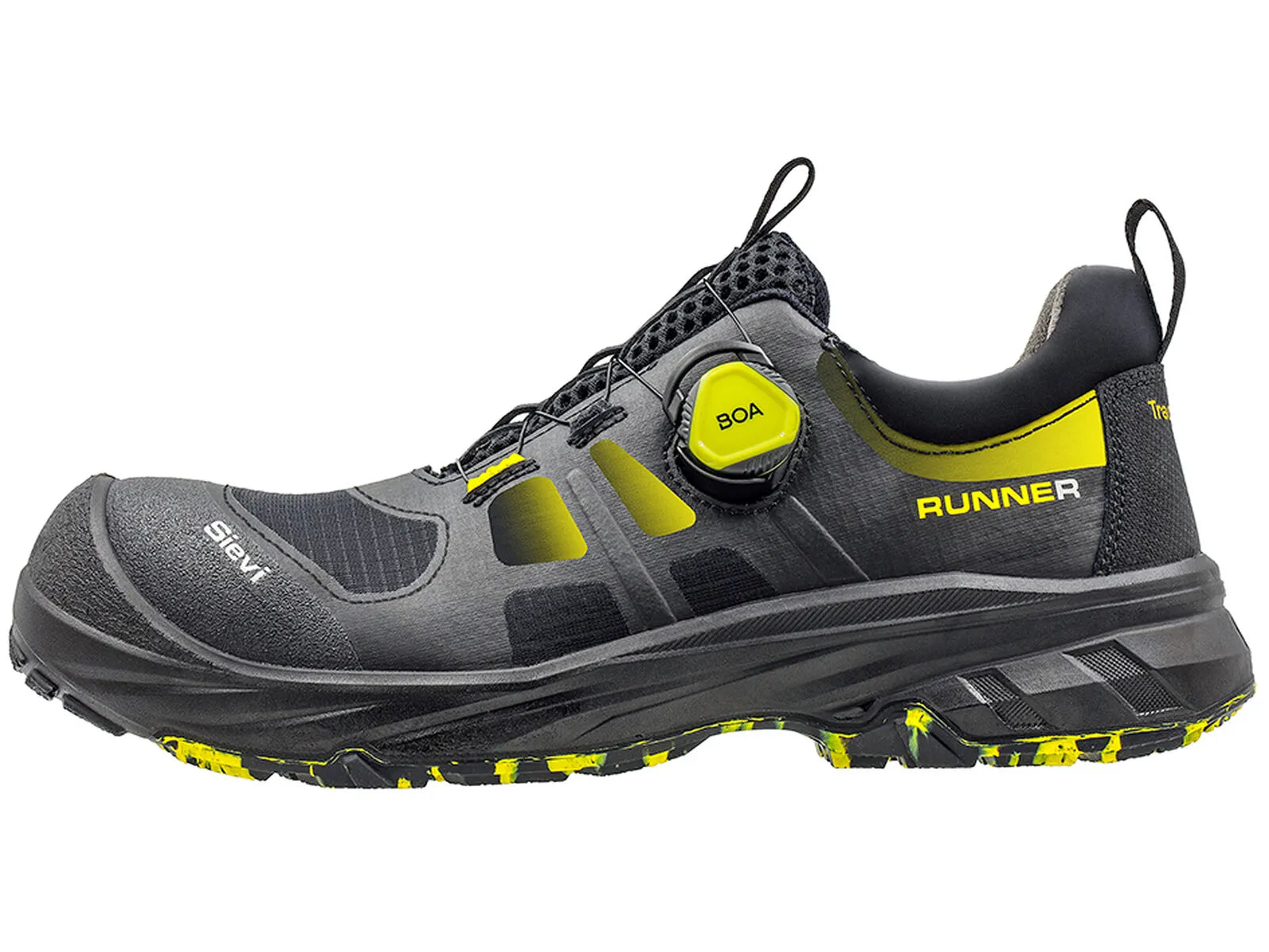 Runner Rollers konstruktion, fri från metall, består av ett tåskydd av komposit som isolerar bra mot värme och kyla, samt ett spikskydd av textil. Sulans utmärkta grepp och slitagetålighet har säkerställts genom friktionssulan Sievi TractionPro®, vars modernt formgivna sulkonstruktion som breddar nedåt ökar användningskomforten och stötdämpningen, speciellt till fotens stödområden.
