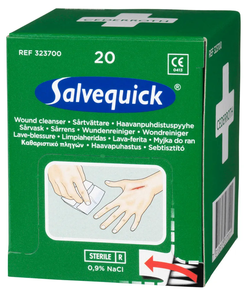 Salvequick Sårtvättare är smidiga och enkla att använda. Väl skyddade i sina förpackningar. Rengöringsvätskan utgörs av steril fysiologisk koksaltlösning.